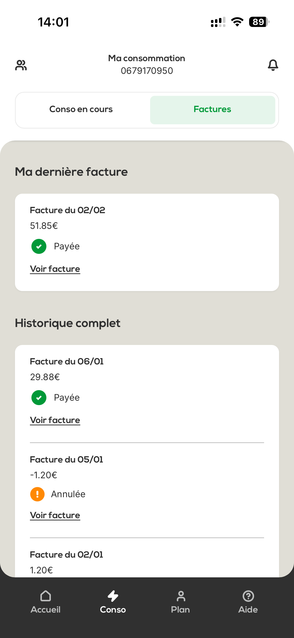 Easy access : All your invoices accessible in two clicks (Conso > Factures)
