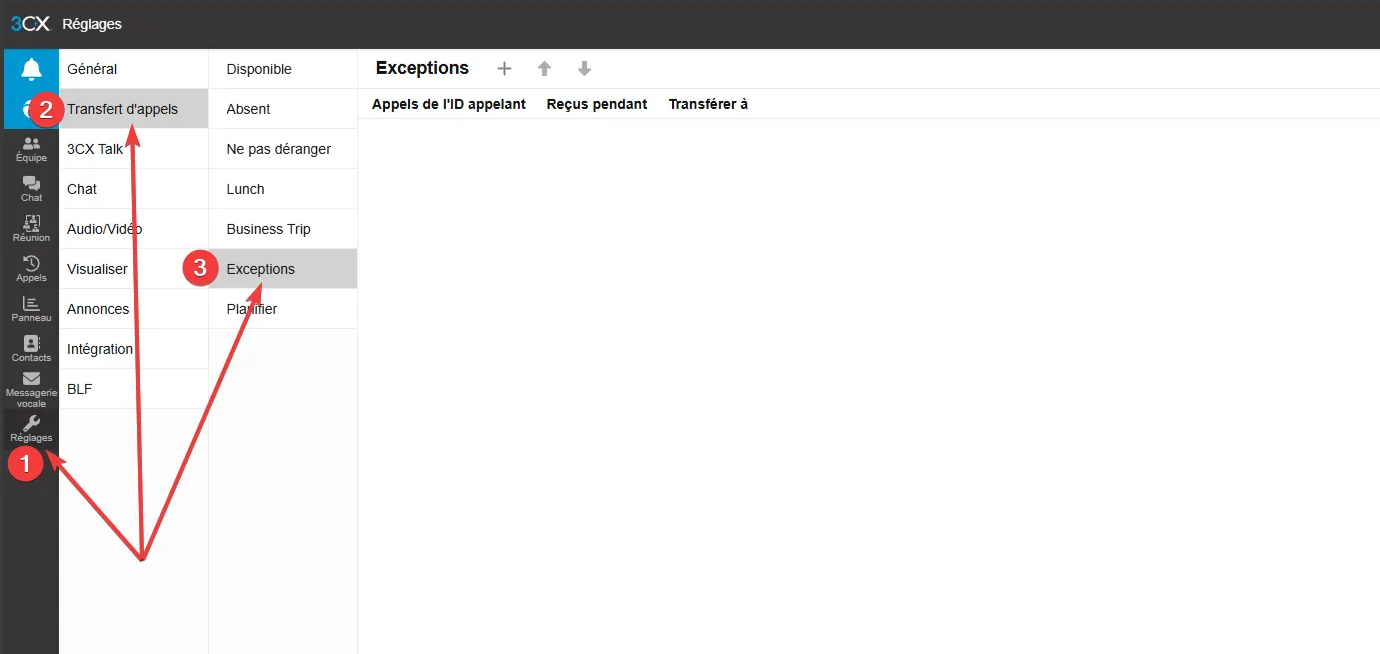 3. Résumé rapideAllez dans Réglages > Transfert d'appel > Exceptions.
