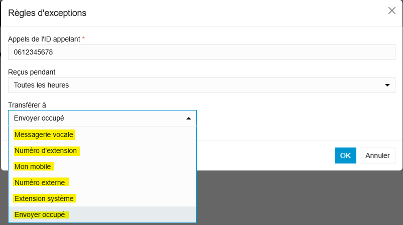 Exemple Spam : Transférer vers "Terminer l'appel" (raccroche immédiatement).