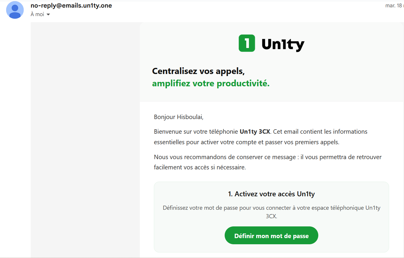 Lors de la première activation, toutes ces informations sont envoyées automatiquement par email (expéditeur : no-reply@emails.un1ty.one).