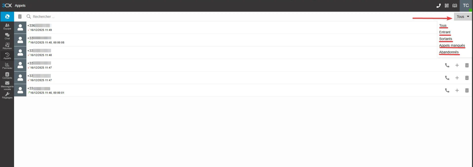 Par défaut, la liste affiche "Tous" les appels. Pour retrouver plus facilement une information, utilisez les filtres situés en haut de la liste :