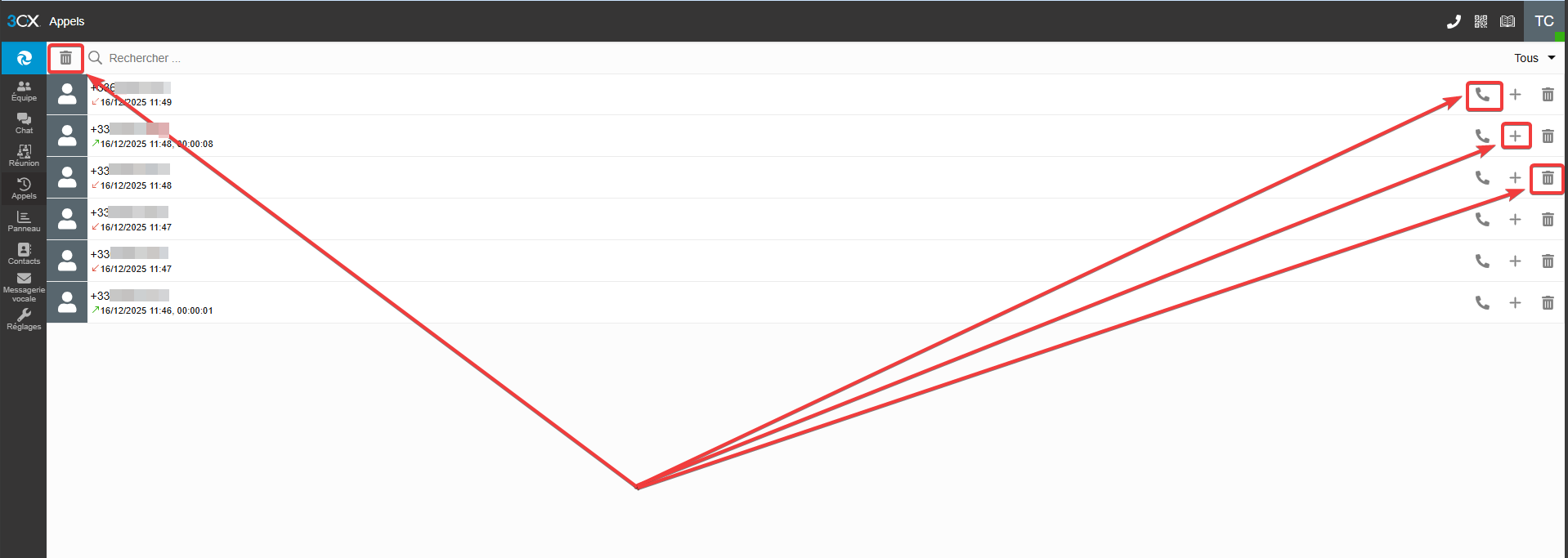 Passez votre souris sur une ligne d'appel pour faire apparaître les boutons d'action rapides à droite :