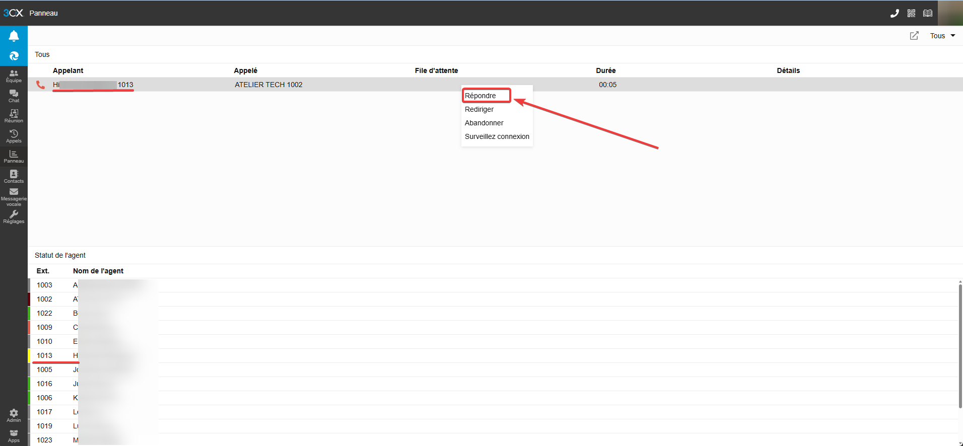 Intercepter un appel "déjà décroché" (En conversation) : Si l'agent parle déjà et que vous voulez prendre le relais, vous ne pouvez pas "Intercepter". Vous devez utiliser la fonction "Transfert" (clic droit sur l'appel > Transfert > vers votre propre extension) ou "Intervenir".