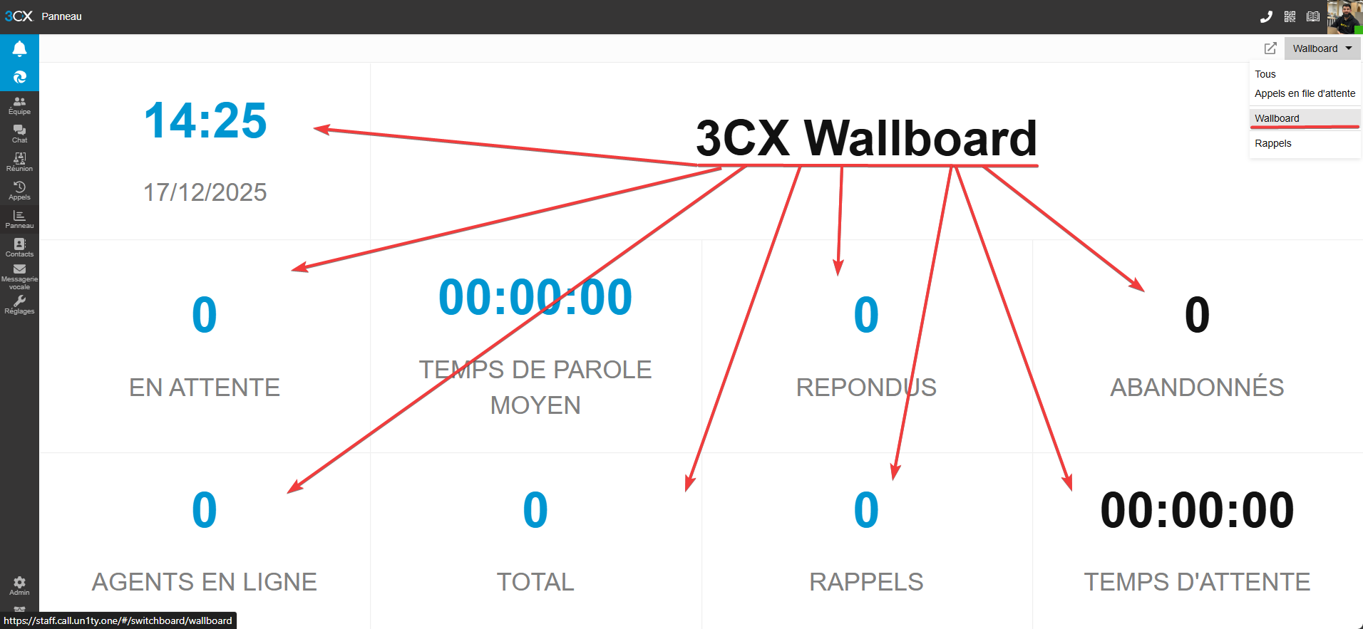 Remarques et AstucesCycle de remise à zéro : Les statistiques du Wallboard (appels répondus, abandonnés, etc.) ne sont pas infinies. Elles se remettent à zéro automatiquement selon une fréquence définie par votre administrateur (souvent quotidiennement à minuit).