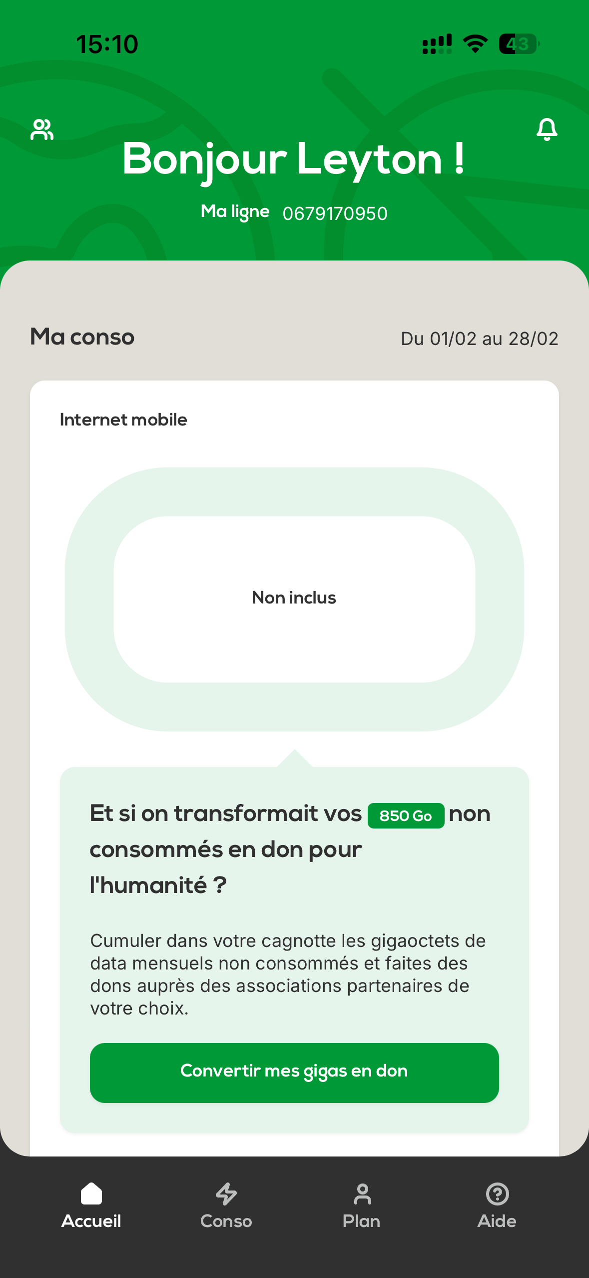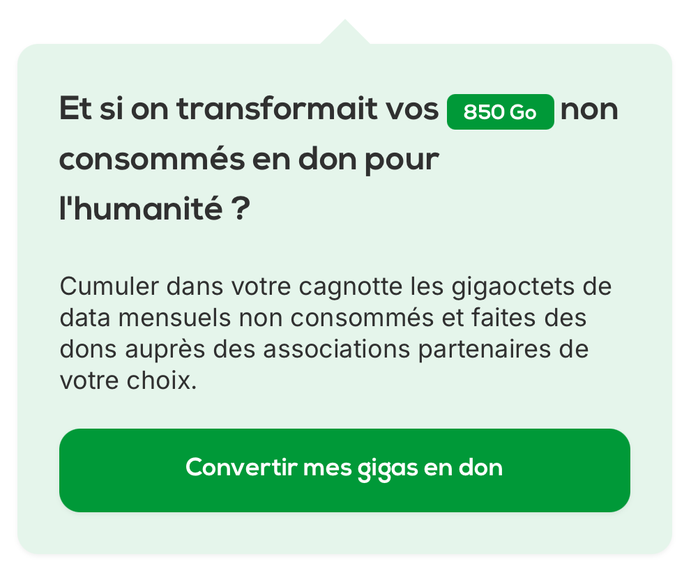 Sur la page d'accueil, vous pouvez visualiser votre consommation de données et le nombre de gigas disponibles. Si vous disposez de suffisamment de gigas, le bouton « Convertir mes gigas en dons » sera accessible.