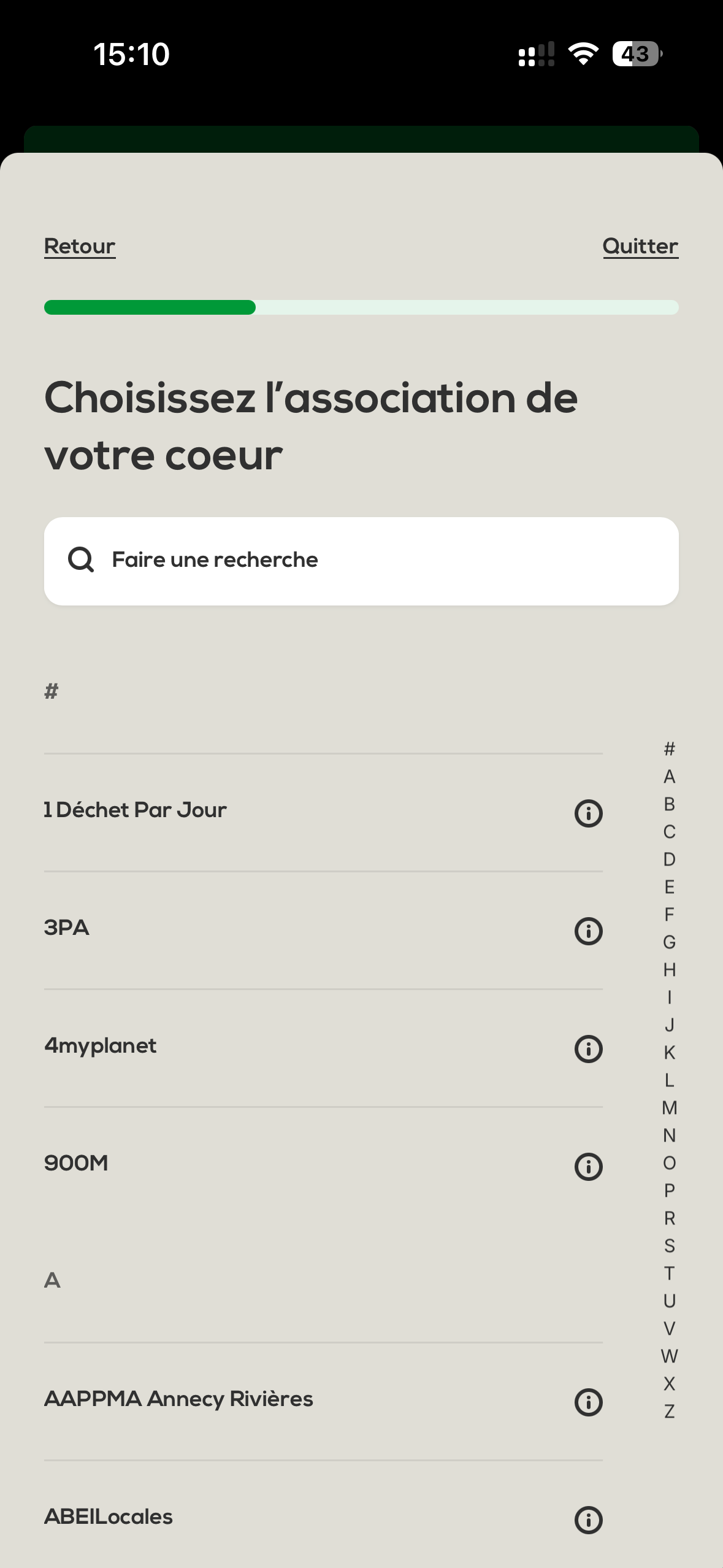 Vous accédez maintenant à la liste des associations partenaires. Parcourez les différentes associations disponibles et sélectionnez celle que vous souhaitez soutenir.