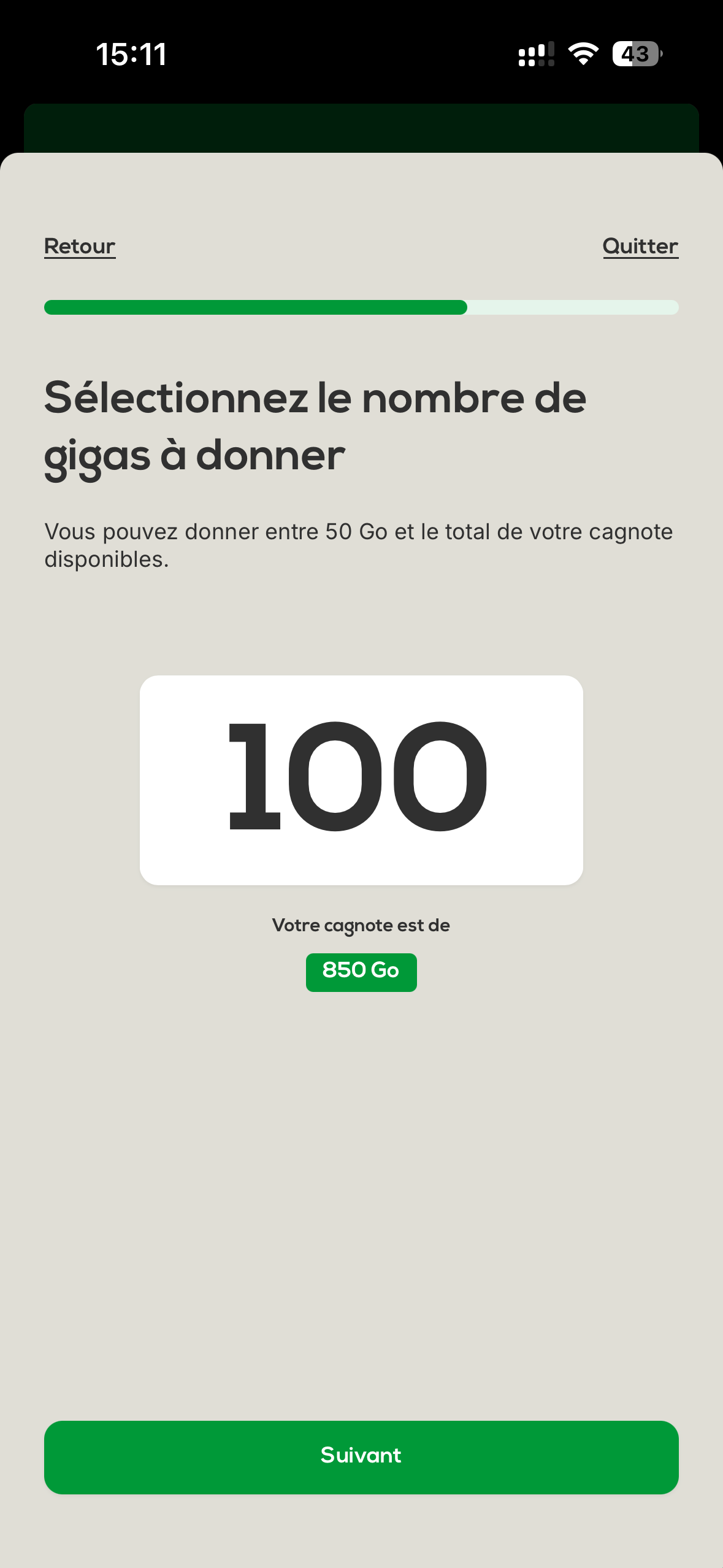 Par exemple, si vous souhaitez donner 100 gigas, saisissez ce montant puis cliquez sur « Suivant ».