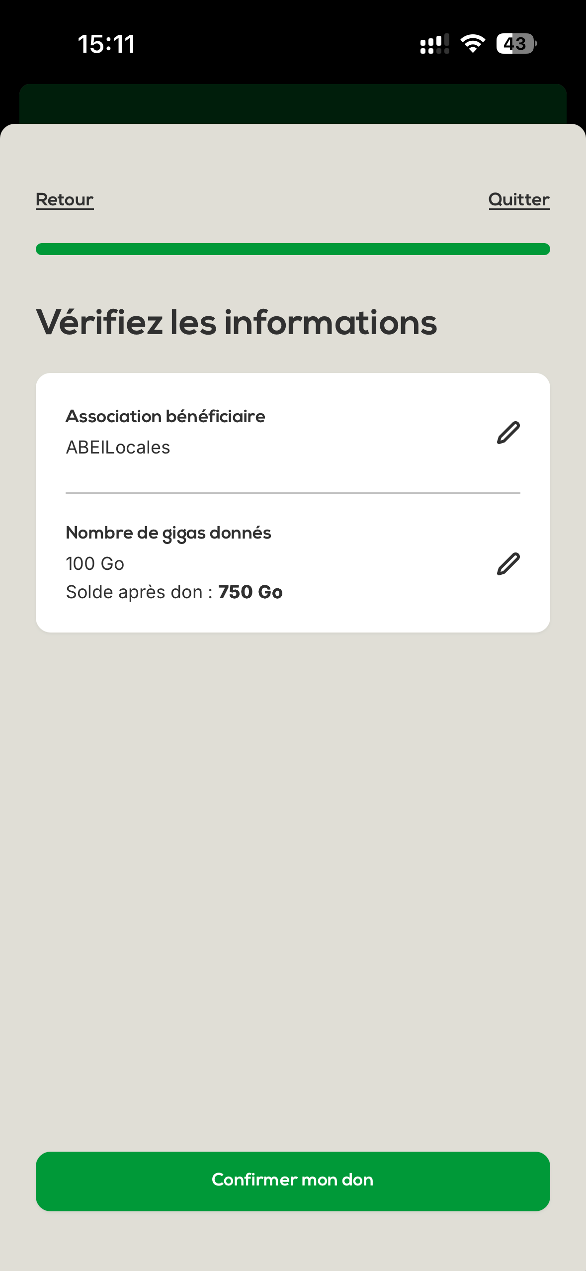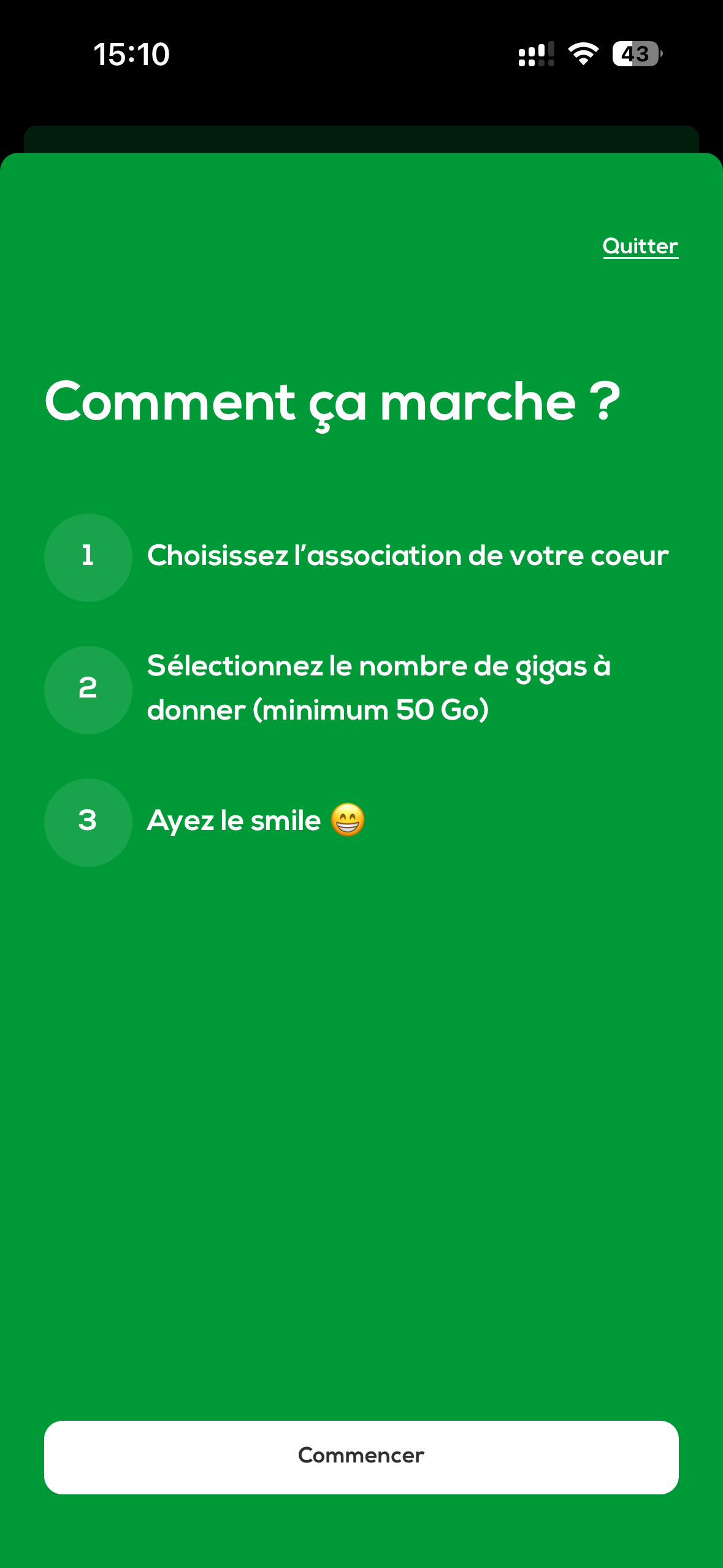 Après avoir cliqué sur « Convertir mes gigas en dons », un écran récapitulatif s'affiche pour vous expliquer le fonctionnement de la donation en deux étapes :