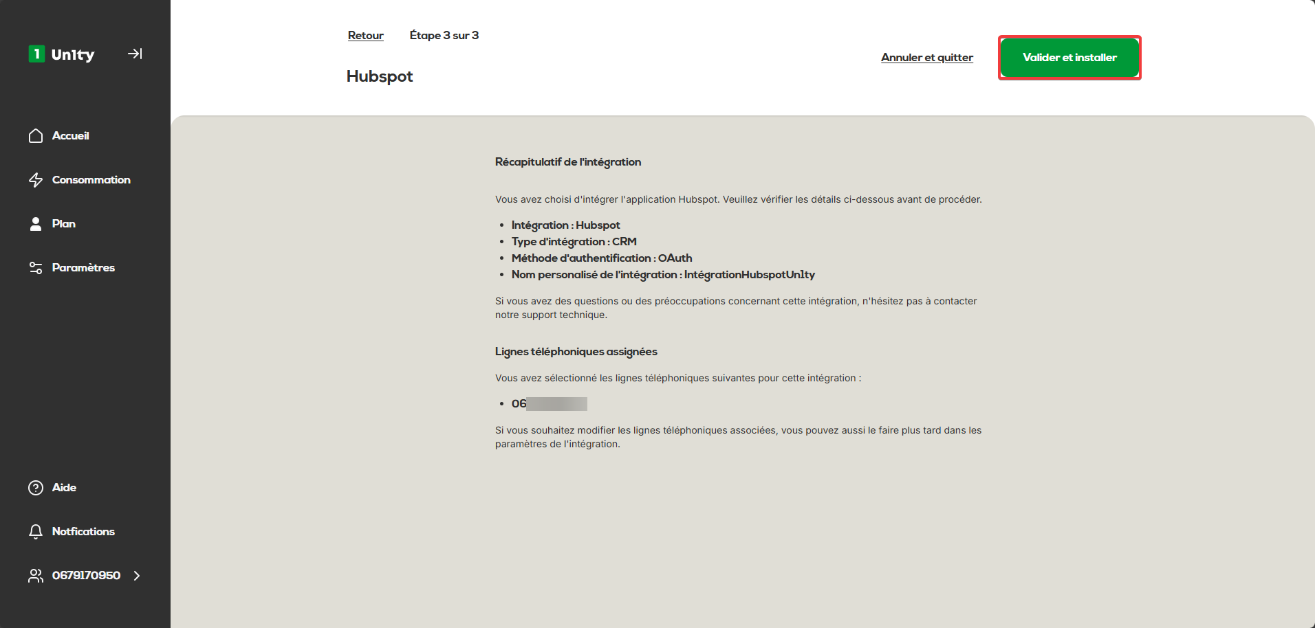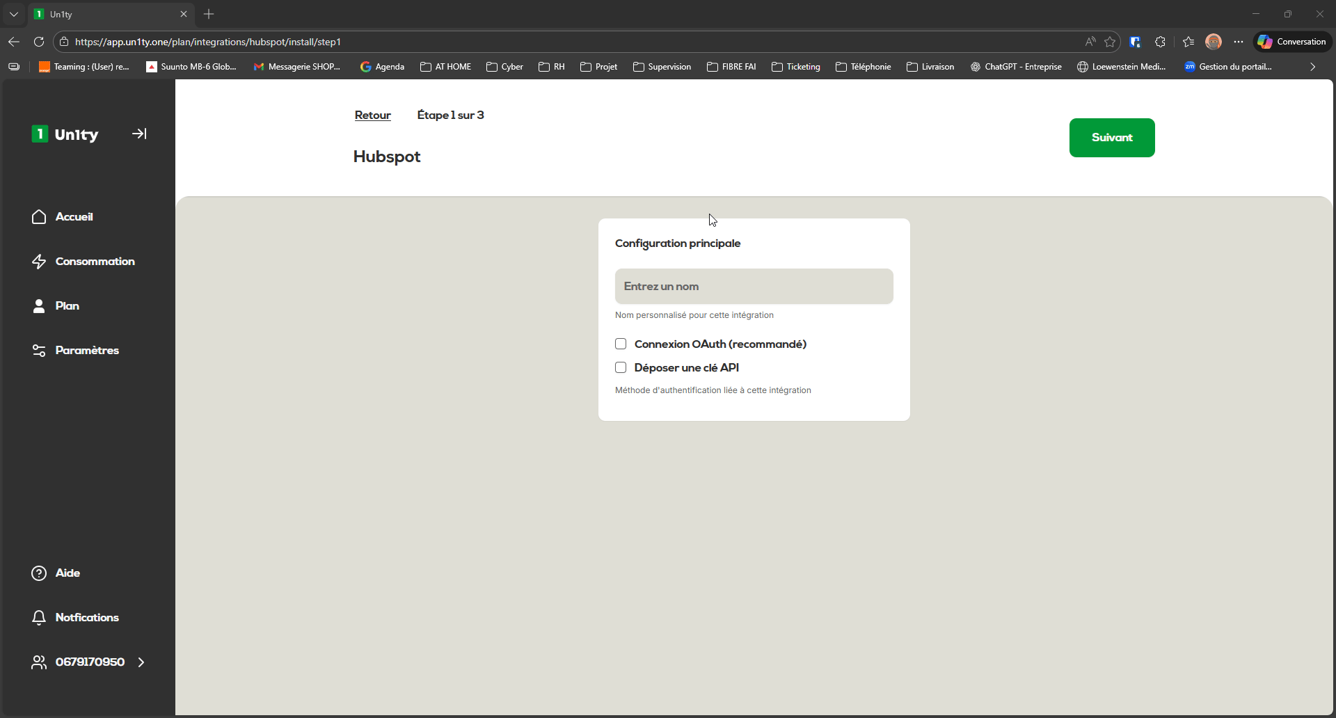 Nom personnalisé : Renseignez un nom (ex : IntégrationHubspotUn1ty).