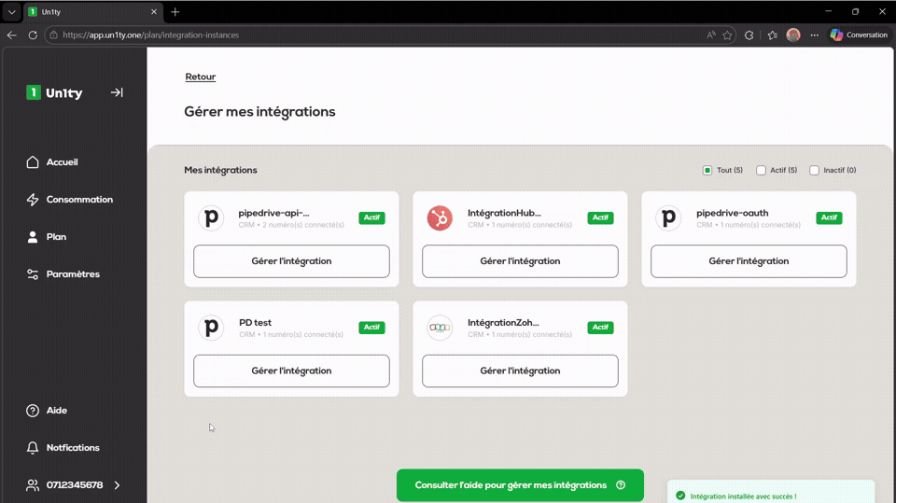 Une fois l'autorisation validée, vous serez automatiquement redirigé vers la page "Gérer mes intégrations" sur votre interface Un1ty.